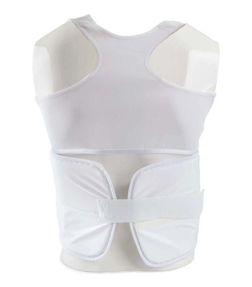 Les panneaux de protection se placent juste sous la poitrine, avec une pièce de plastron en lycra au-dessus, dans laquelle se loge la plaque pectorale. De nombreuses athlètes féminines trouvent cette configuration plus confortable qu'une protection dorsale intégrale.